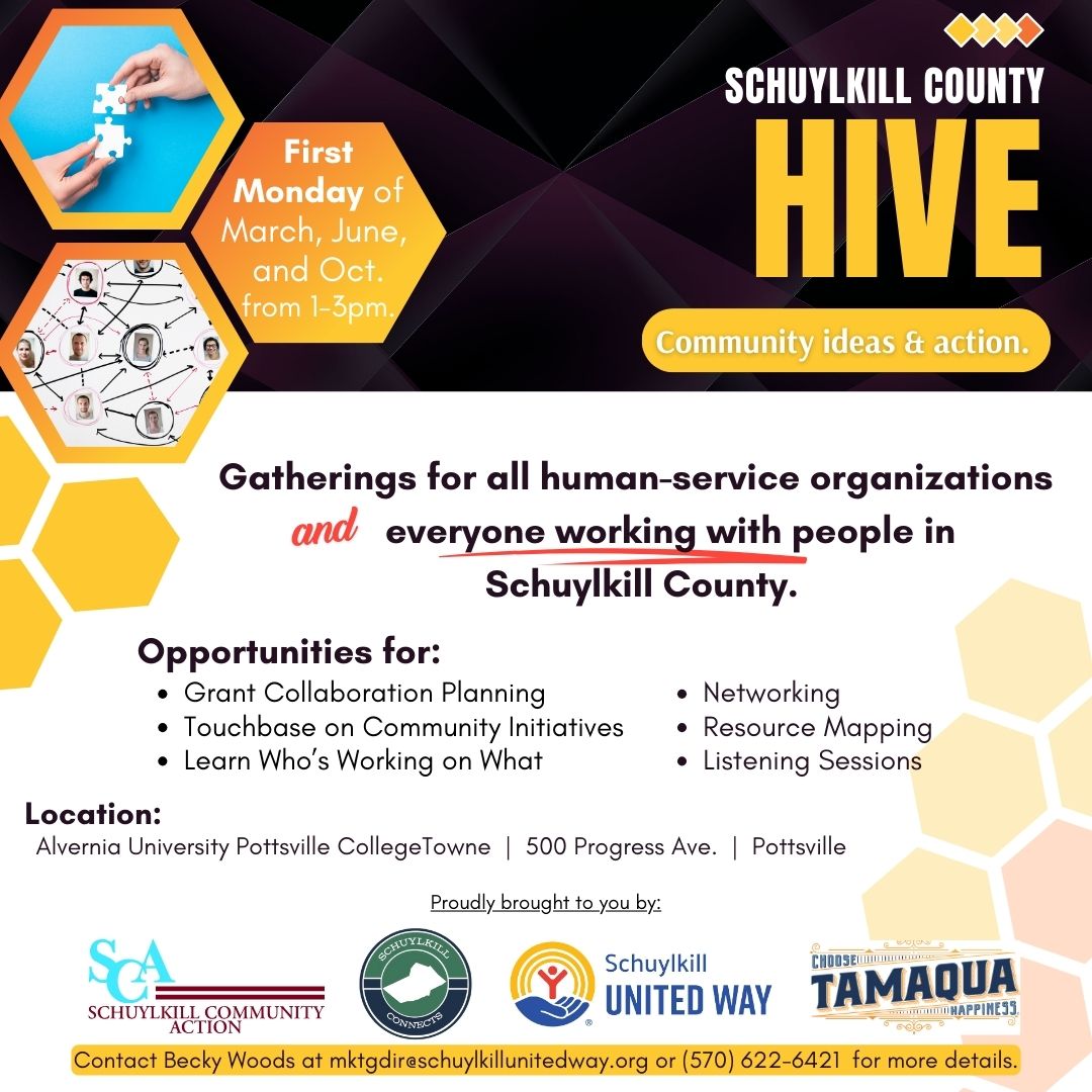 This is a long-term initiative that will grow to meet the expressed needs of those who attend HIVE gatherings. Schuylkill County HIVE gatherings happen on the first Mondays of March, June, and October from 1 PM – 3 PM at Alvernia Pottsville CollegeTowne, located at 500 Progress Avenue in Pottsville. The next HIVE is Monday, October 6, 2025.